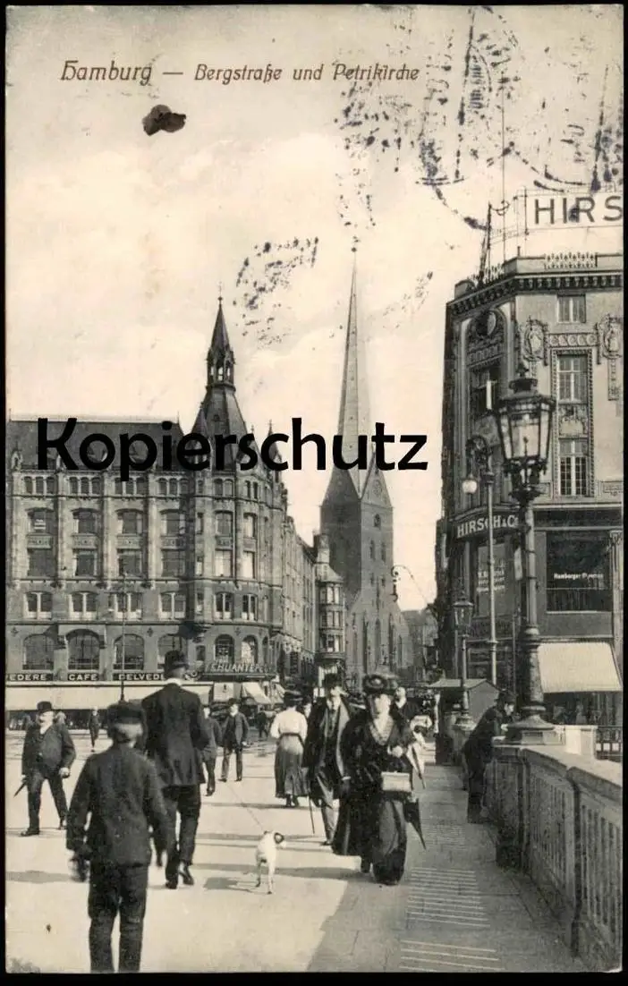 ALTE POSTKARTE HAMBURG BERGSTRASSE UND PETRIKIRCHE 10.10.10 HIRSCH CAFE BELVEDERE FUSSGÄNGER HUND dog chien