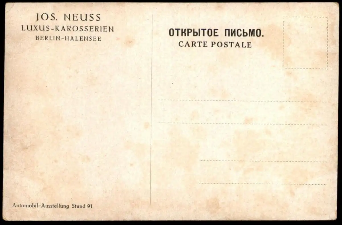 ALTE POSTKARTE JOS. NEUSS CAROSSERIE DAME HUT LUXUS-KAROSSERIEN BERLIN HALENSEE AUTOMOBIL AUSSTELLUNG STAND 91Verlag: unbekanntGelaufen: neinErhaltung (s. Scan): gut / 918501