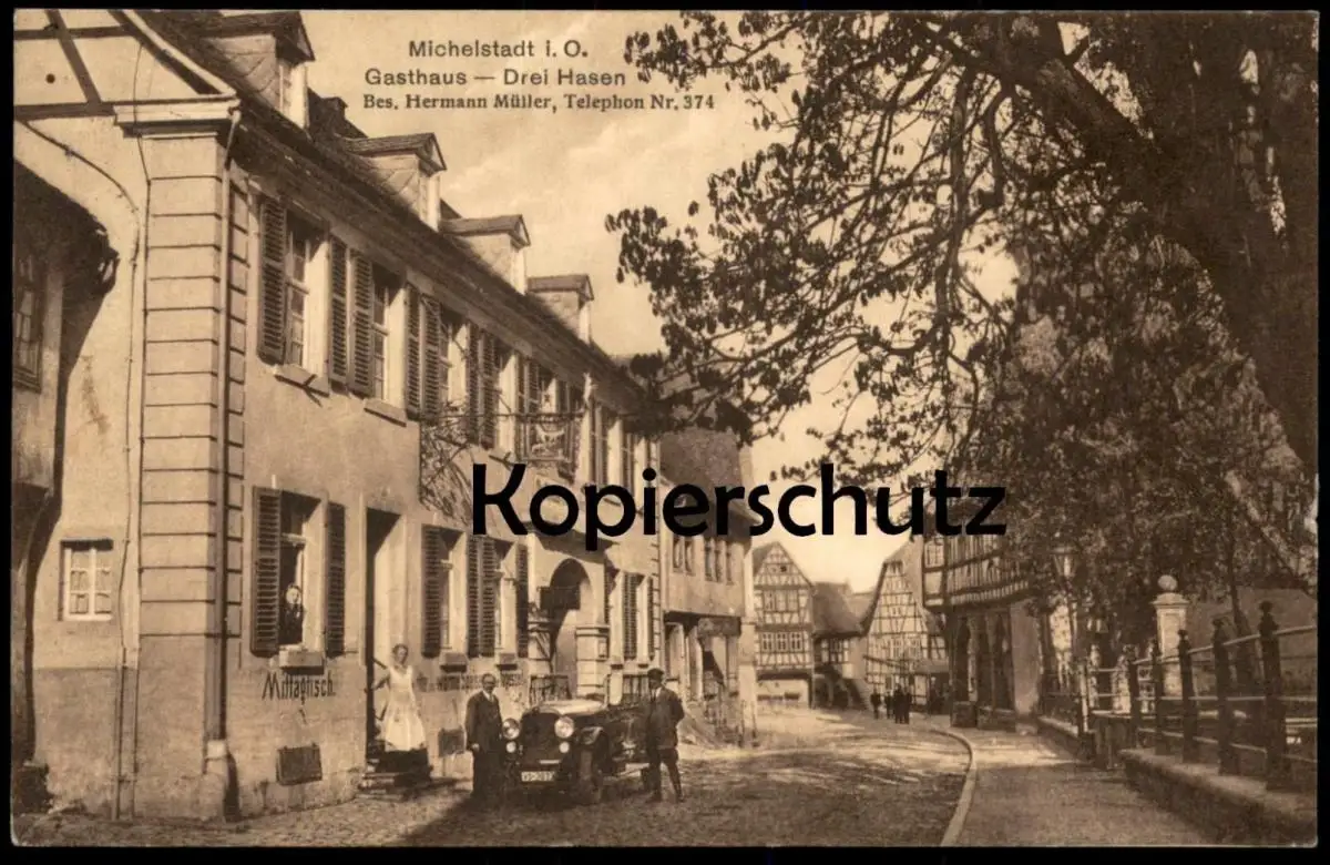 ALTE POSTKARTE MICHELSTADT ODENWALD GASTHAUS DREI HASEN BES. HERMANN MÜLLER ALTES AUTO oldtimer Ansichtskarte postcard