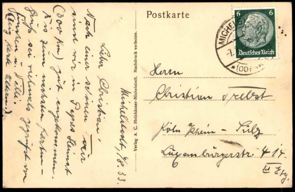 Gelaufen: 07.08.1933 mit Stempel Michelstadt nach Köln