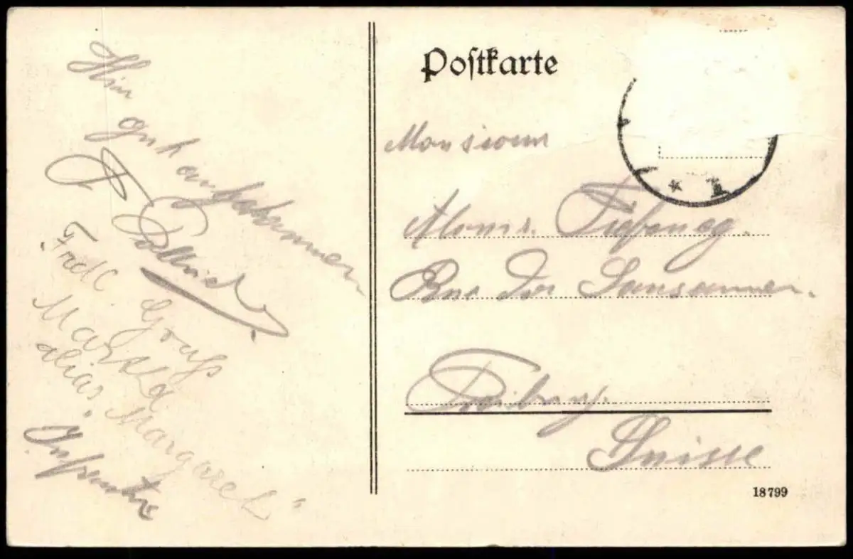 Gelaufen: xx.xx.19xx nach Fribourg, Schweiz, Briefmarke mit etwas Spuren entfernt