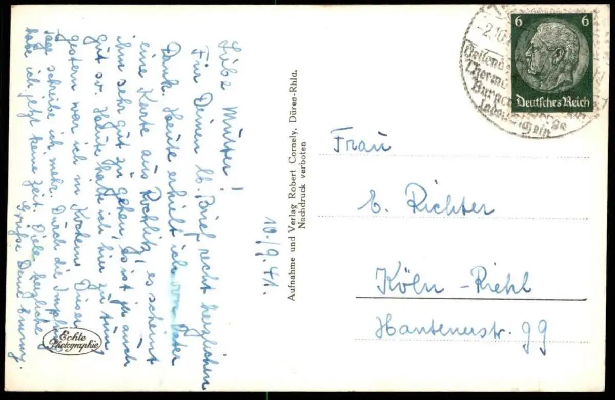 Gelaufen: 02.10.1941 mit Stempel Traben-Trarbach nach Köln-Riehl