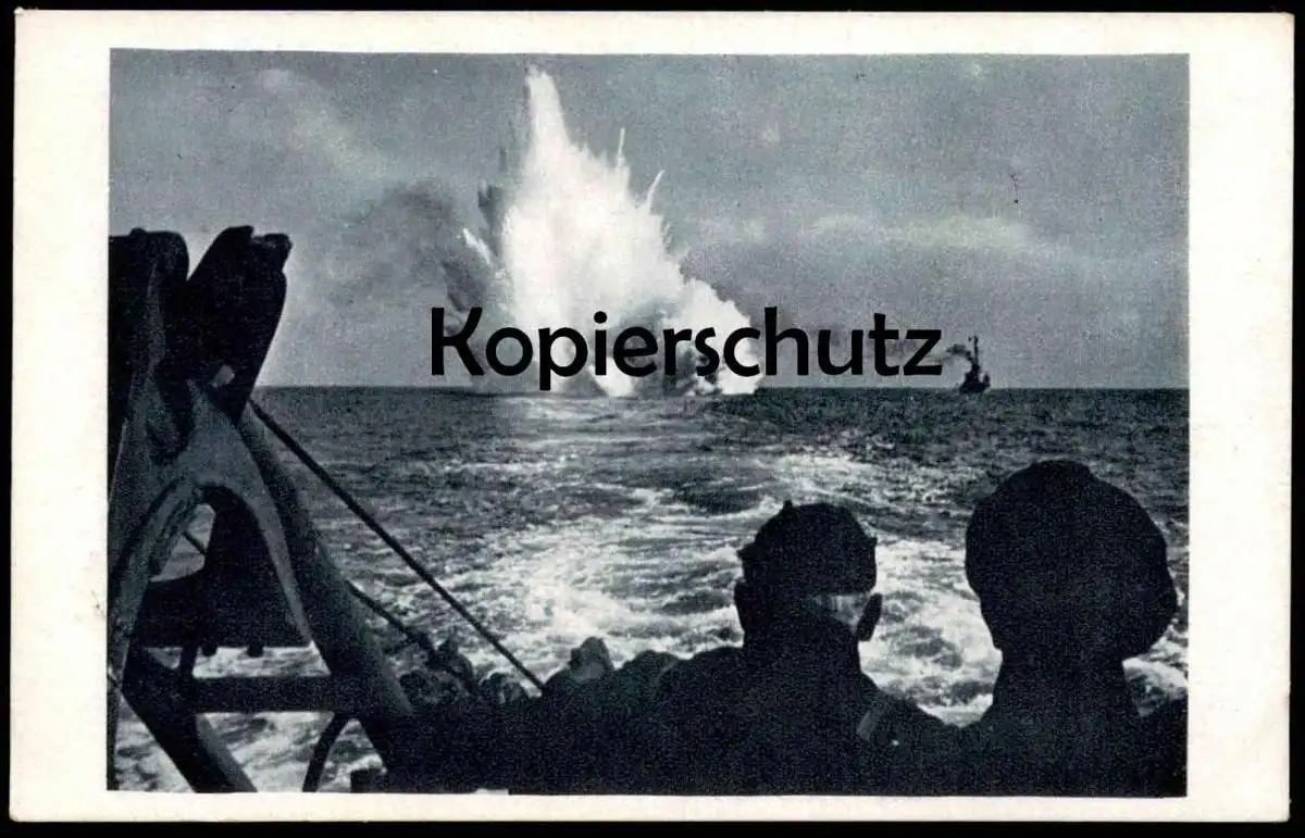 ALTE POSTKARTE VON DER ARBEIT DER MINENSUCHBOOTE ZWEI MINEN DETONIEREN DETONATION MARINE Kriegsschiff warship postcard