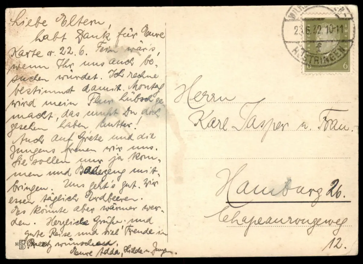 Gelaufen: 23.06.1932 mit Stempel Wilhelmshaven Rüstringen nach Hamburg