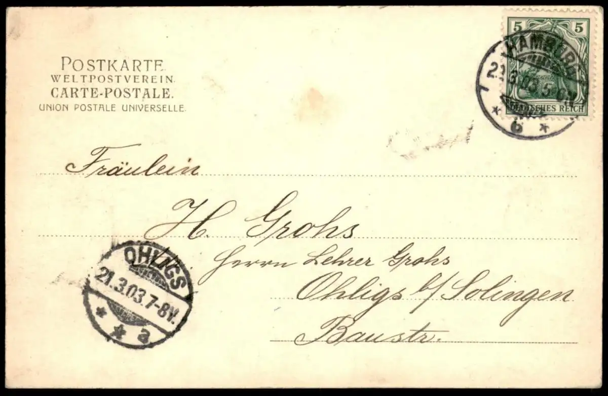Gelaufen: 21.03.1903 mit Stempel Hamburg nach Ohligs