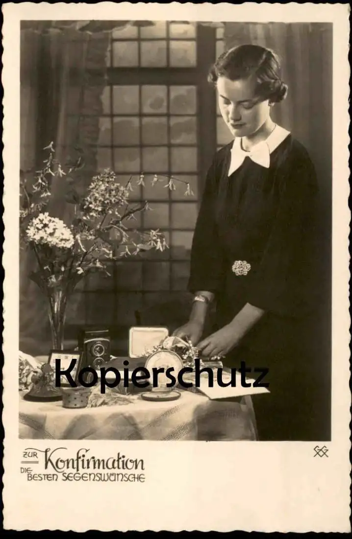 ALTE POSTKARTE ZUR KONFIRMATION DIE BESTEN WÜNSCHE GESCHENKE KAMERA ROLLEICORD FOTOAPPARAT WECKERVerlag: unbekannt