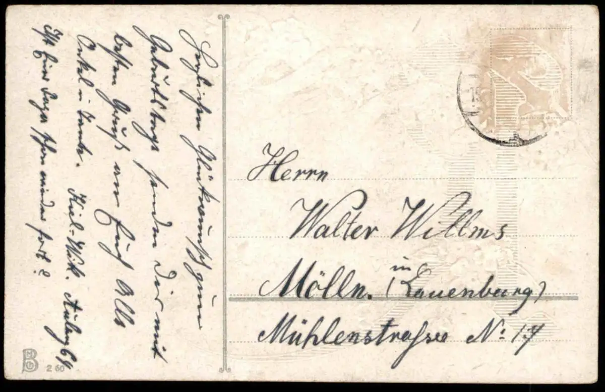 Gelaufen: xx.xx.19xx von Kiel-Wik nach Mölln, Briefmarke (sauber) entfernt