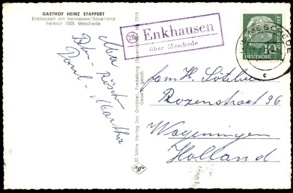 Gelaufen: 17.07.1957 mit Stempel Meschede sowie Landpoststempel 21b Enkhausen über Meschede