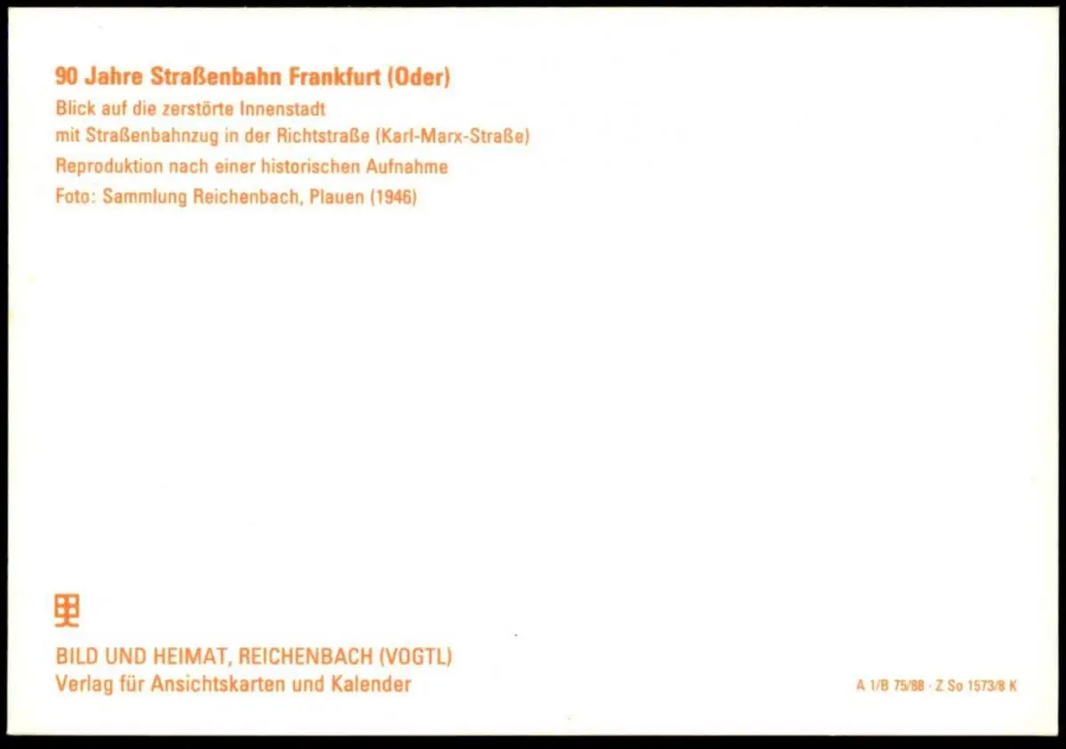 ÄLTERE POSTKARTE FRANKFURT ODER BLICK AUF DIE ZERSTÖRTE INNENSTADT MIT STRASSENBAHNZUG IN DER RICHTSTRASSE (KARL-MARX-STRASSE) REPRODUKTION NACH EINER HISTORISCHEN AUFNAHMEVerlag: Bild und Heimat, Reichenbach; Foto: Reichenbach, Plauen (1946)