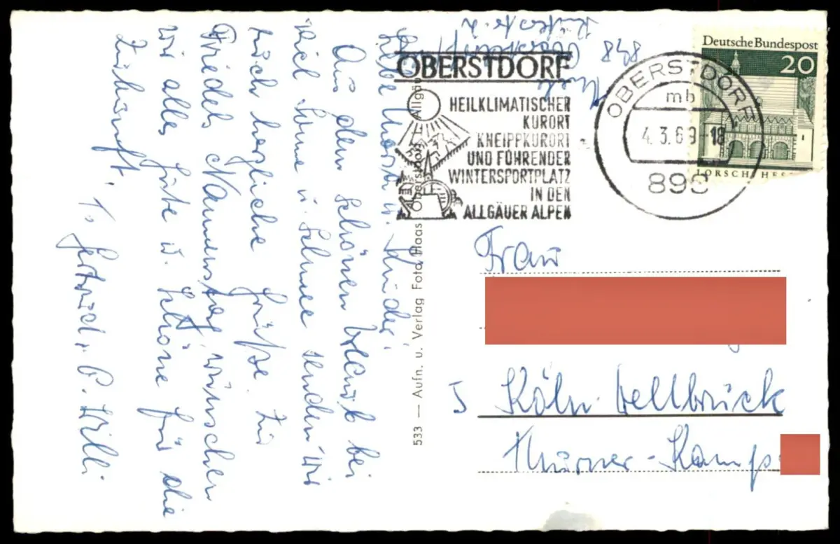 Gelaufen: 04.03.1969 mit Stempel Oberstdorf nach Köln-Dellbrück