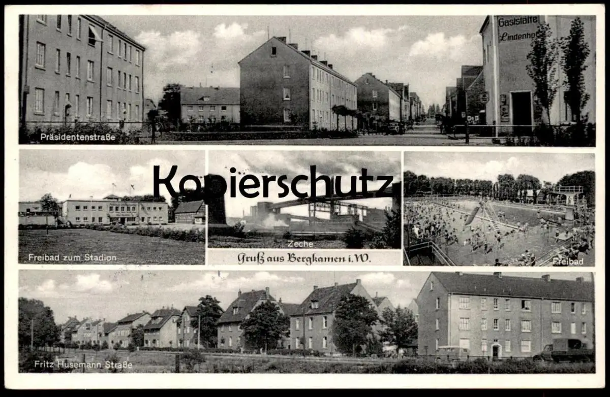 ÄLTERE POSTKARTE GRUSS AUS BERGKAMEN ZECHE PRÄSIDENTENSTRASSE FREIBAD ZUM STADION FRITZ HUSEMANN STRASSE KAMEN AK