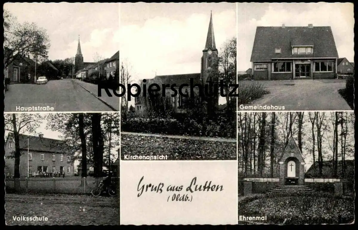 ÄLTERE POSTKARTE GRUSS AUS LUTTEN GEMEINDEHAUS EHRENMAL HAUPTSTRASSE VOLKSSCHULE KIRCHE GOLDENSTEDT IN OLDENBURG AK cpa