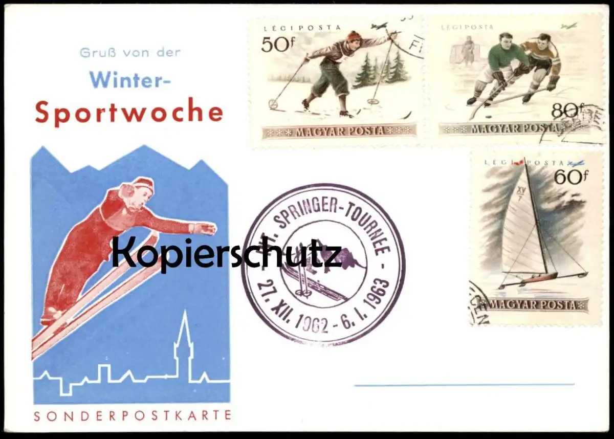 ÄLTERE POSTKARTE GRUSS VON DER WINTER-SPORTWOCHE SRINGER-TOURNEE 27.12.1962 - 06.01.1963 MIT BRIEFMARKEN UNGARN EISHOCKEY LANGLAUF SEGELN Verlag: unbekannt