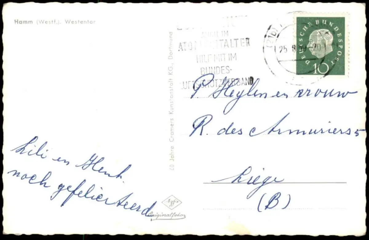Gelaufen: 25.08.1959 mit Maschinenwerbestempel „Luftschutz auch im Atomzeitalter - Hilf mit im Bundesluftschutzverband“ nach Liège