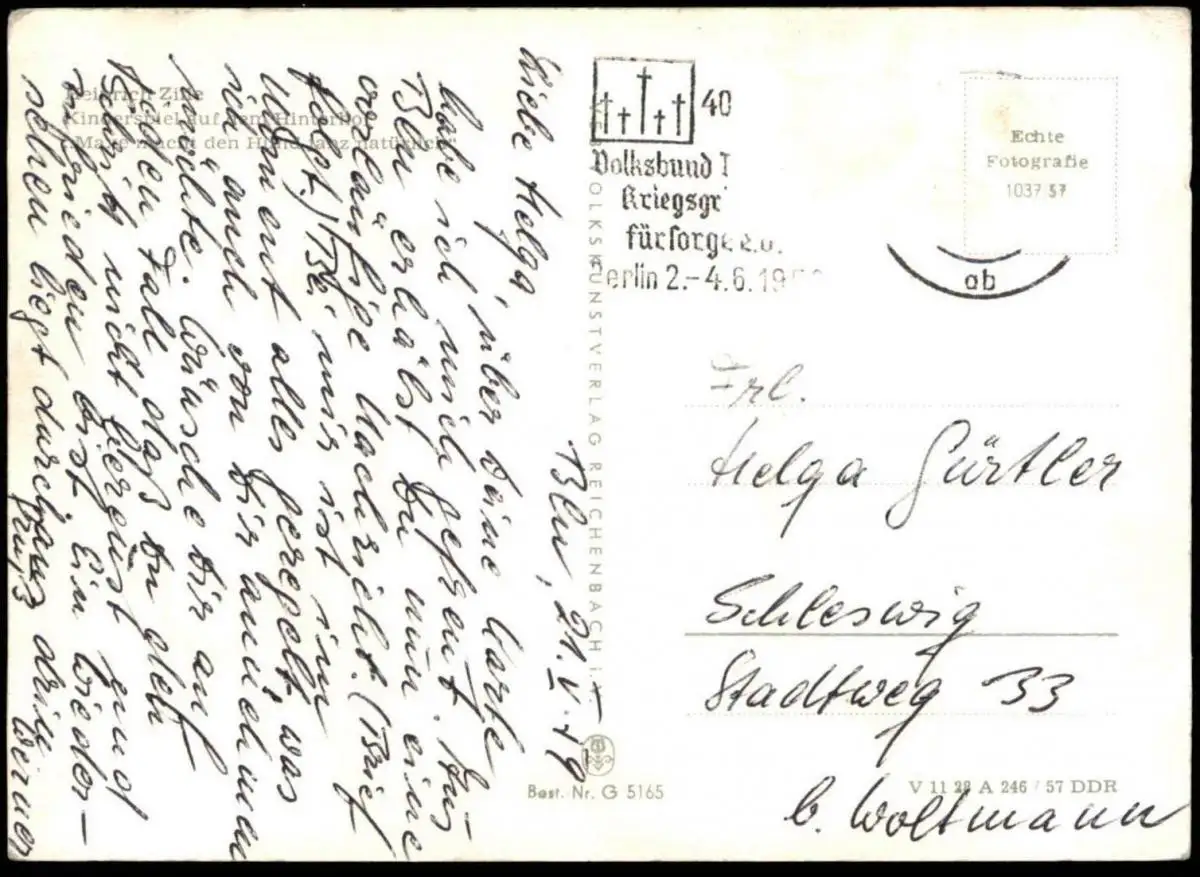Gelaufen: 21.05.1959 von Berlin nach Schleswig, Briefmarke (sauber) entferntErhaltung (s. Scan): gut - mittel, rechts oben etwas bestoßen / 916387