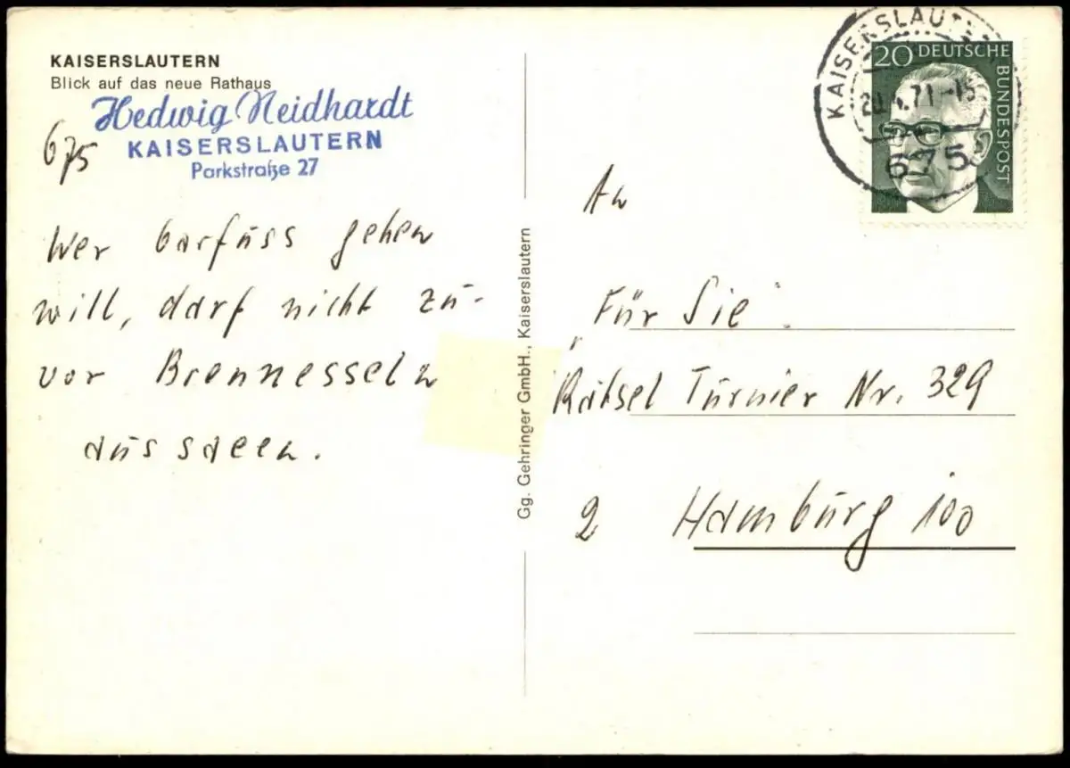 Gelaufen: 20.04.1971 mit Stempel Kaiserslautern nach Hamburg