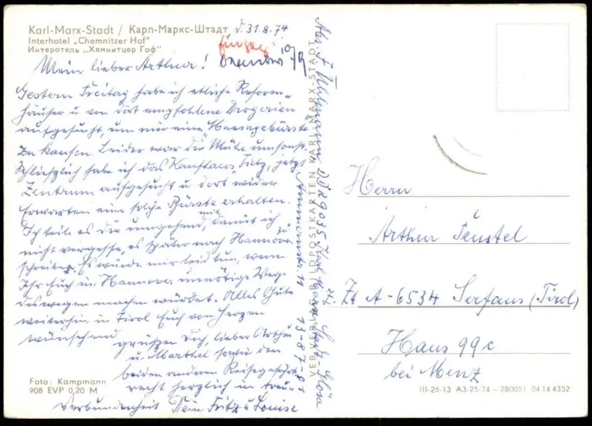 Gelaufen: 31.08.1974 nach Serfaus, Briefmarke (sauber) entfernt