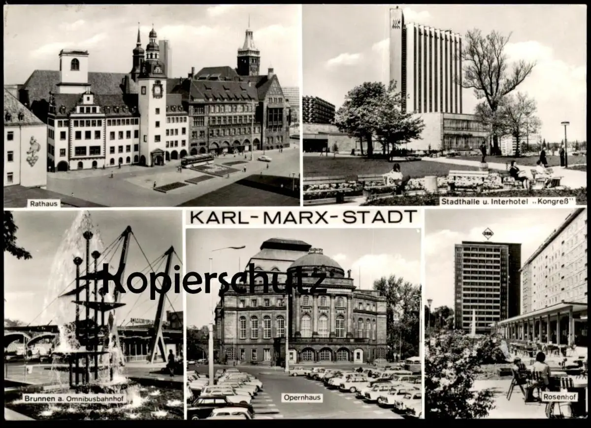 ÄLTERE POSTKARTE KARL-MARX-STADT ROSENHOF STADTHALLE INTERHOTEL KONGRESS RATHAUS BRUNNEN OMNISBUSBAHNHOF Chemnitz AK cpa