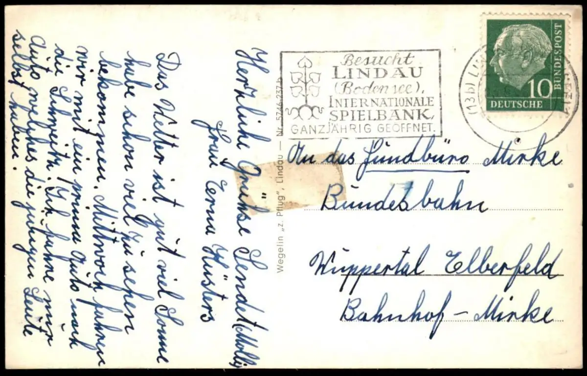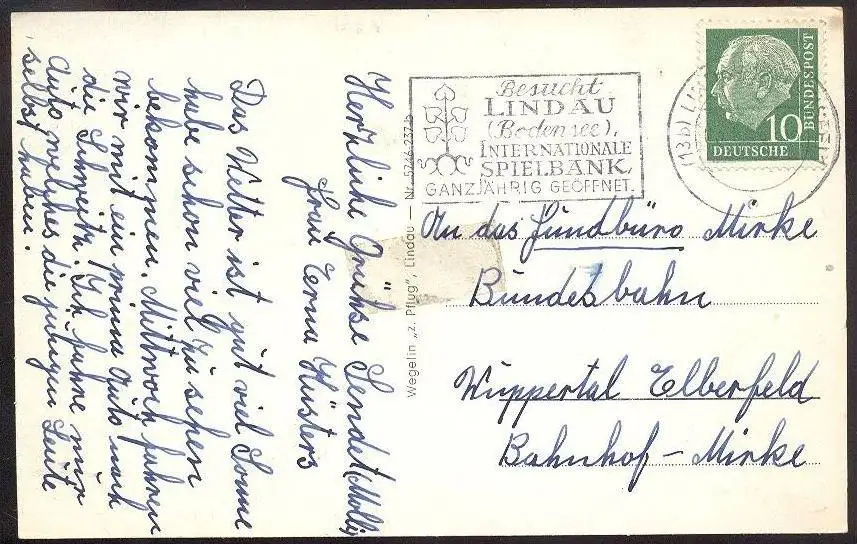 Gelaufen: xx.xx.1956 mit Maschinenwerbestempel Lindau Internationale Spielbank ganzjährig geöffnet an Fundbüro Mirke Bundesbahn Wuppertal Elberfeld Mirker Bahnhof Mirke