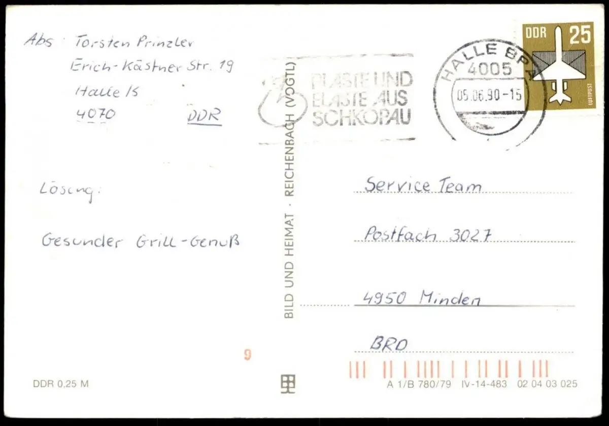 Gelaufen: 05.06.1990 mit Stempel Halle BPA sowie Maschinenwerbestempel „PLASTE UND ELASTE AUS SCHKOPAU“ nach Minden