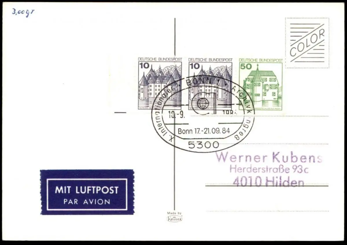 Gelaufen: 18.09.1984 mit Sonderstempel „Internationaler Archivkongress Bonn 17. - 21.09.1984“ nach Hilden