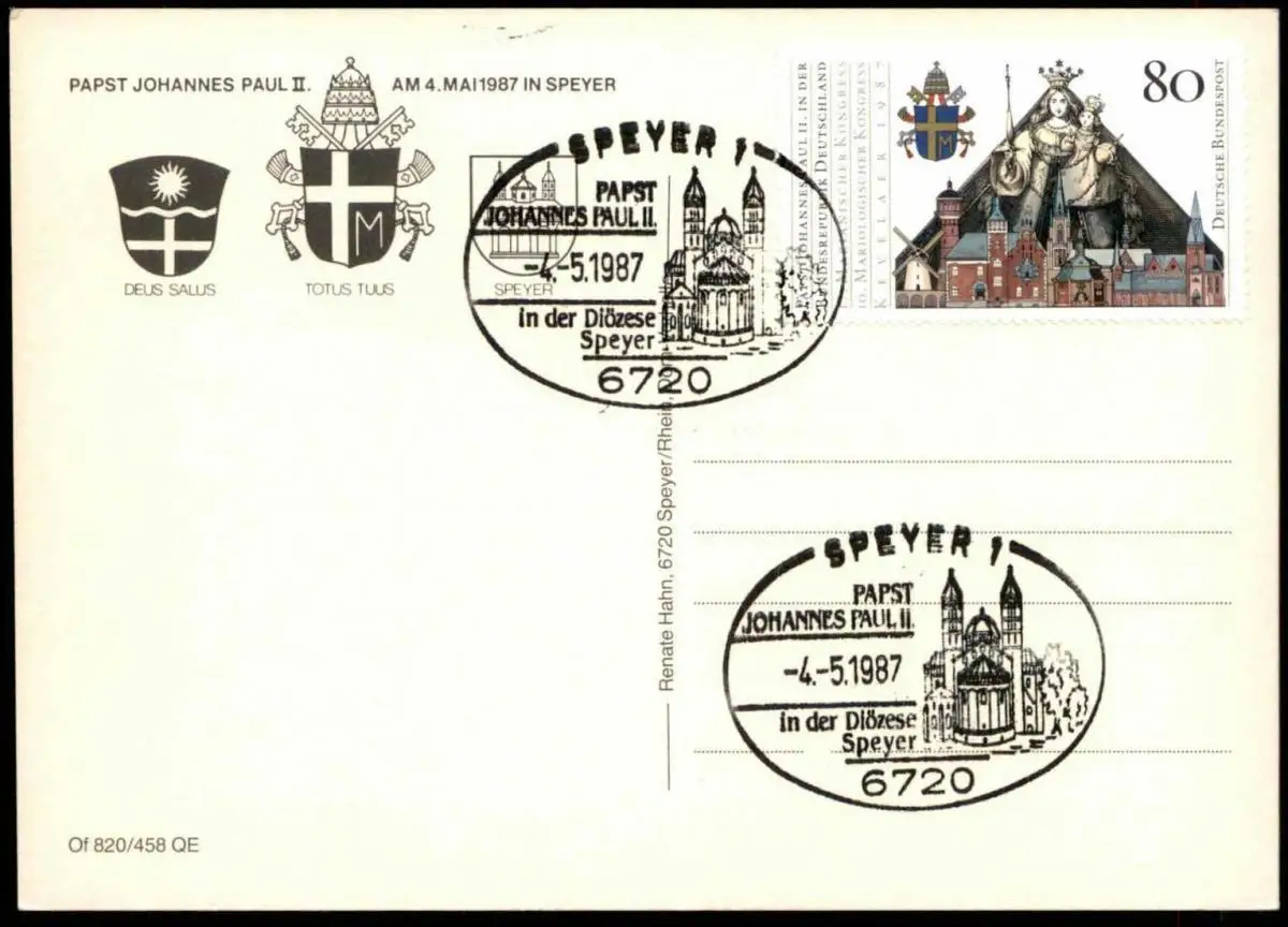 Gelaufen: Sonderbriefmarke Papstbesuch in Deutschland sowie Sonderstempel Papstbesuch in der Diözese Speyer 04.05.1987Erhaltung (s. Scan): gut - sehr gut / 915652