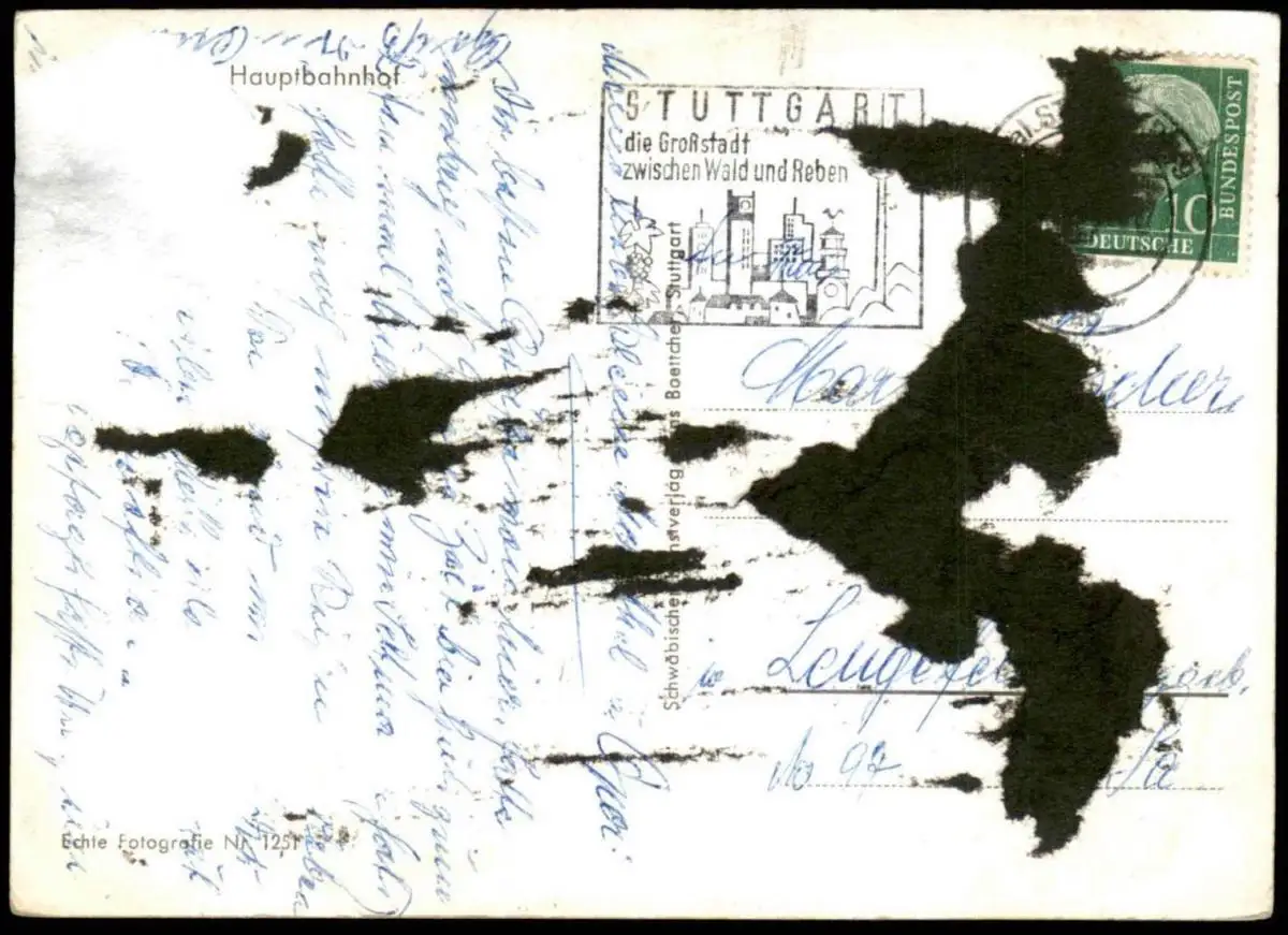 Gelaufen: mit Maschinenwerbestempel Stuttgart die Großstadt zwischen Wald und Reben nach LengefeldErhaltung (s. Scan): schlechter, Ecke oben rechts etwas bestoßen; rückseitig Albumspuren, dadurch rückseitig stärkerer Abrieb der obersten rückseitigen Papierschicht links / 916221