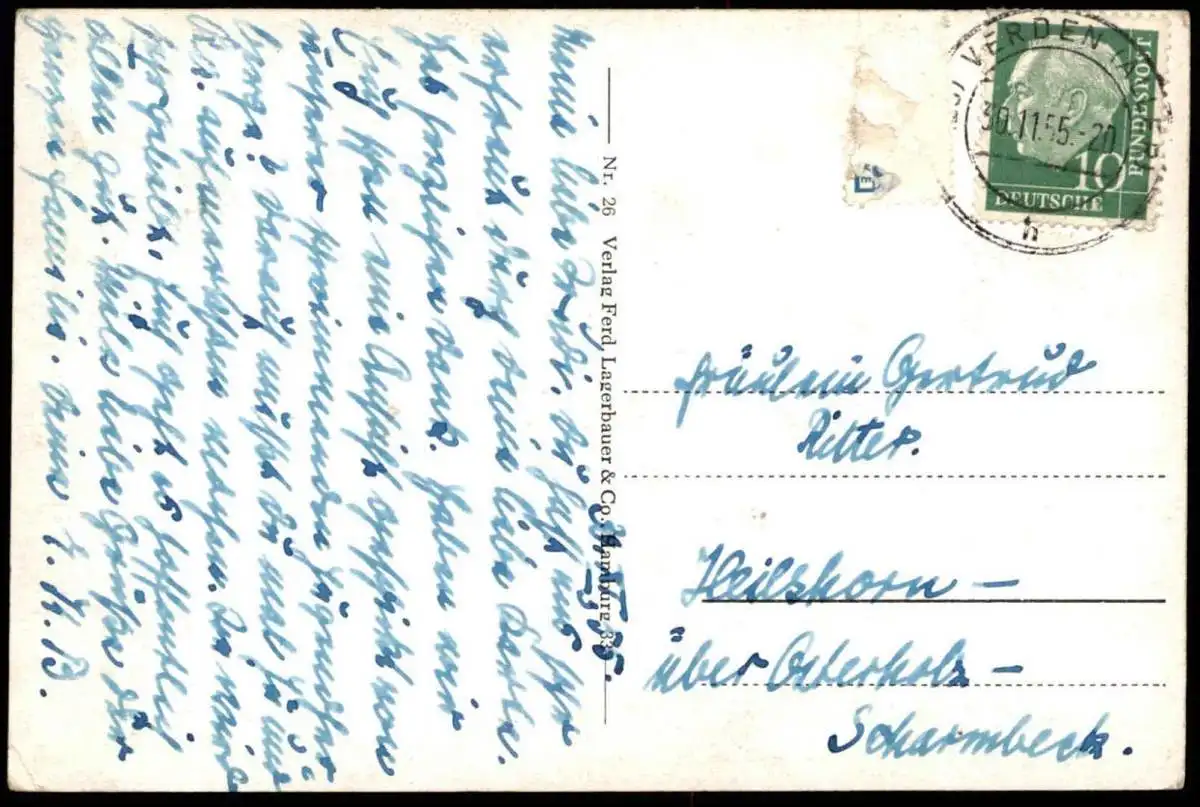 Gelaufen: 30.11.1955 mit Stempel Verden nach Heilshorn über Osterholz-Scharmbeck