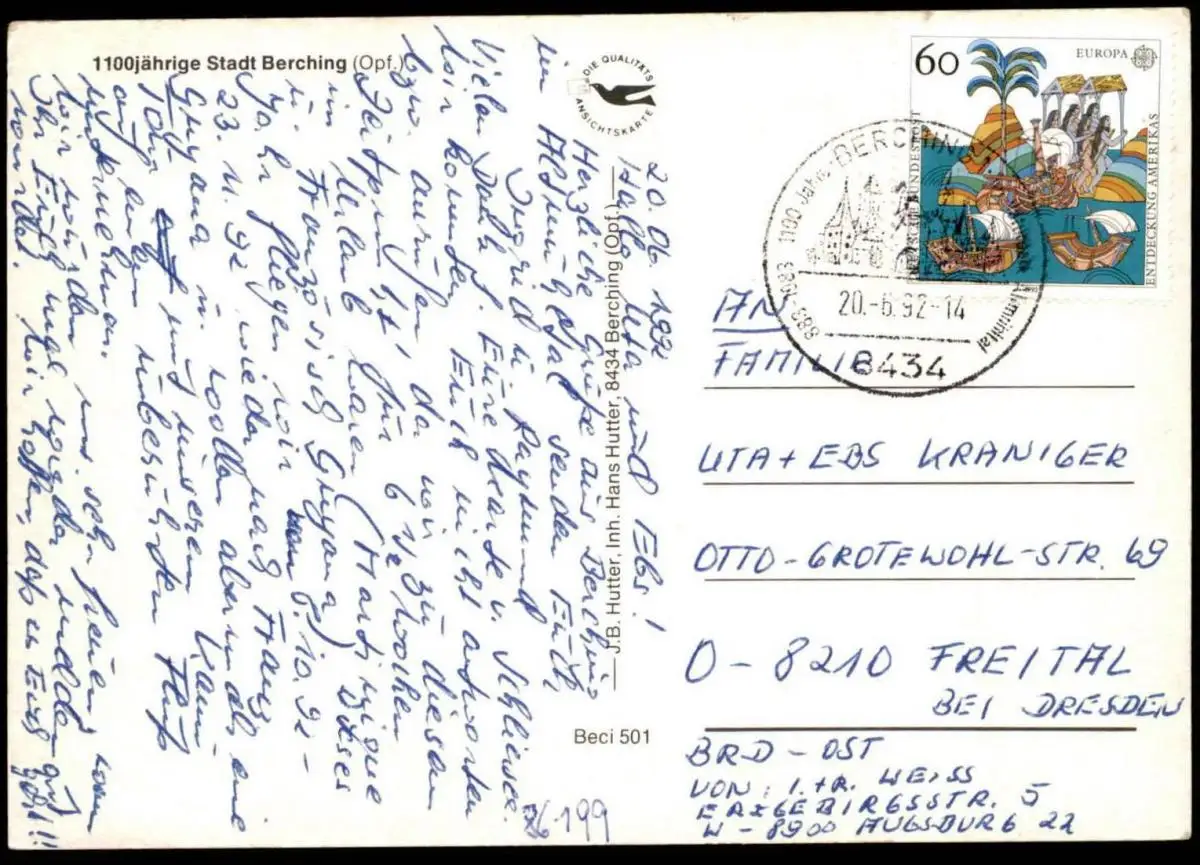 Gelaufen: 20.06.1992 mit Stempel Berching nach Freital bei Dresden
