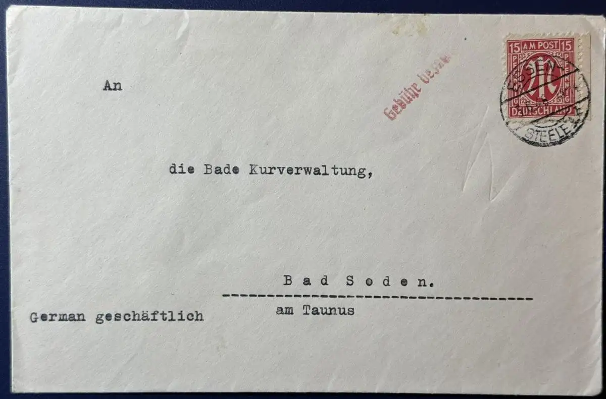 Bedarfsbrief, 1946, frankiert mit Mi.Nr.24, gelaufen mit Poststempel vom 03.06.1946 von Essen Steele nach Bad Soden, gute Erhaltung.