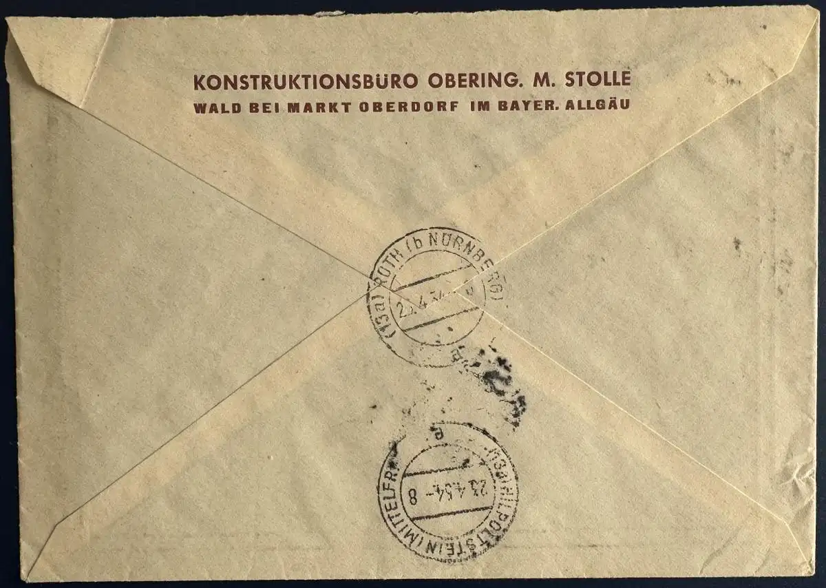 Einschreiben, Mischfrankatur, bestehend aus Mi.Nr.185, 188 und Notopfer, gelaufen mit Poststempel vom 22.04.1954 von München über Roth b.Nbg. nach Hilpoststein.