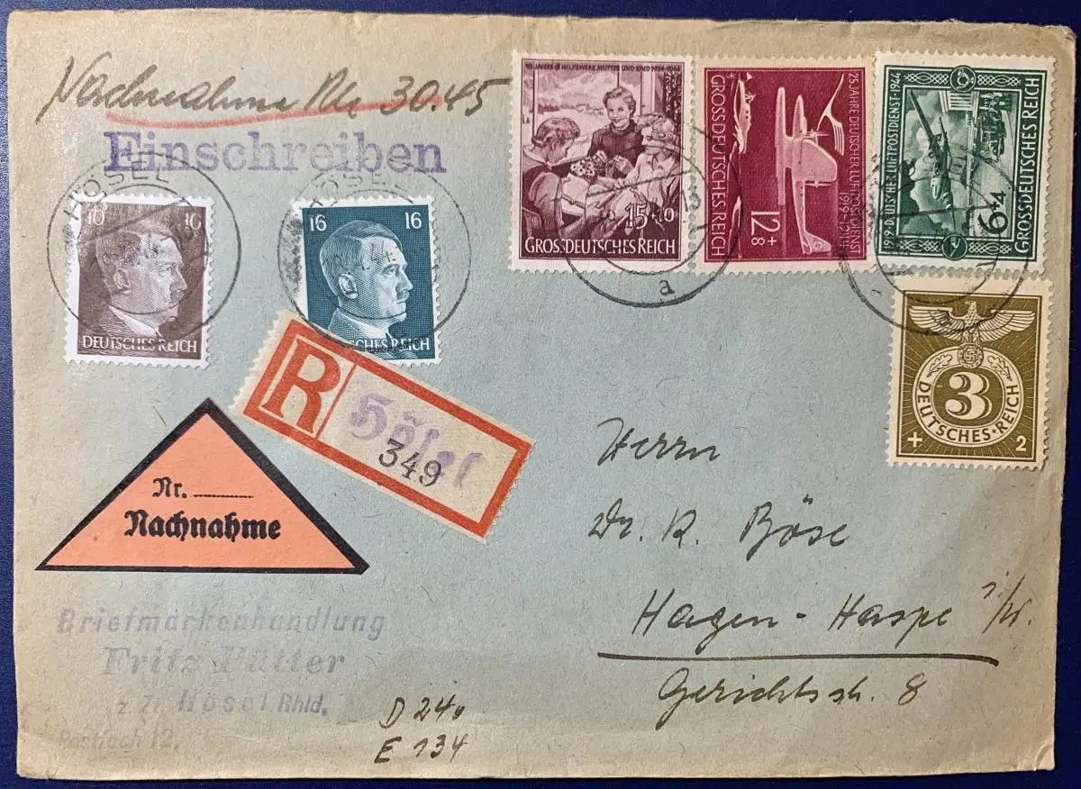 Brief Nachnahme/Einschreiben, gelaufen mit Poststempel vom 18.04.1944 von Hösel nach Hagen-Haspe, Brief ist an den Rändern leicht vergilbt, ansonsten sehr gute Erhaltung, saubere Stempel.