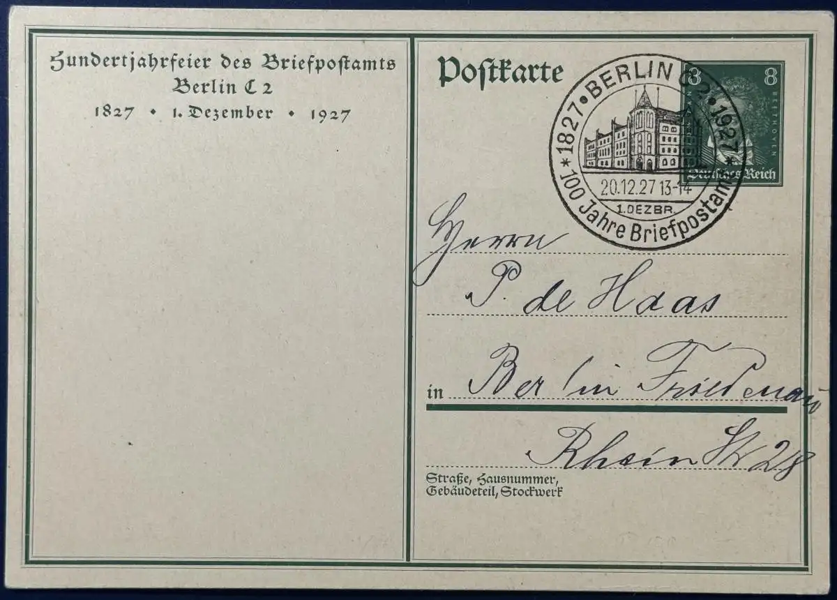 Sonderpostkarte zur Hundertjahrfeier Briefpostamt Berlin C2, Mi.Nr. P179, gelaufen mit Sonderstempel vom 20.12.1927 von Berlin nach B.-Friedenau, sauberer Stempel, sehr gute Erhaltung.
