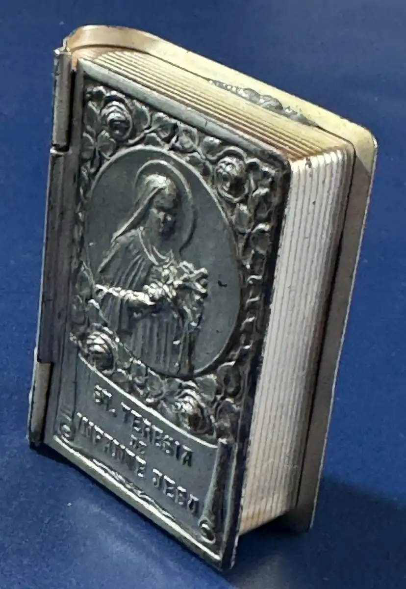 Schatulle in Buchform, Prägung auf der Vorderseite “St. Theresia de Infante Jesu”, versilbert, Maße H 5,2 cm, B 4,2 cm, T 1,3 cm, Gewicht incl. Rosenkranz 29 Gramm.