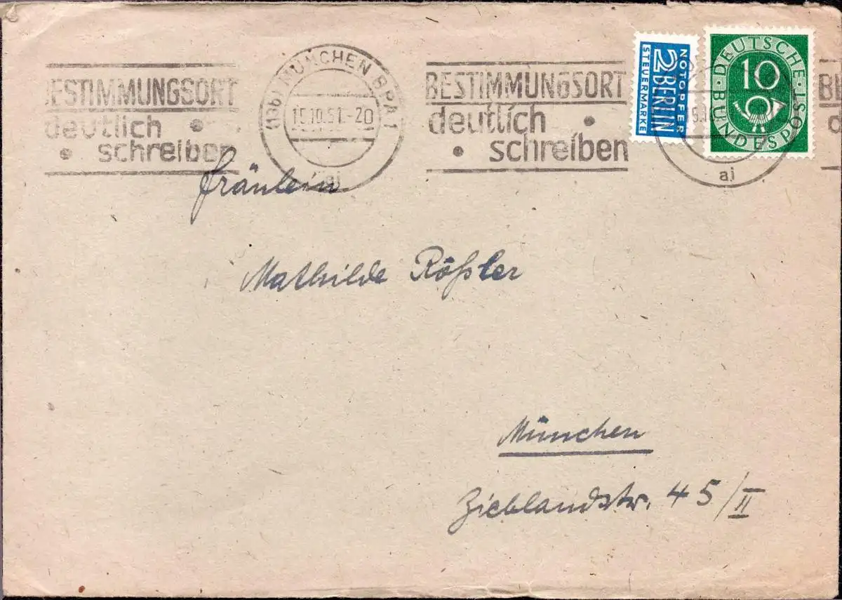 BRD Brief (13b) MÜNCHEN BPA 1 ai - 15.10.51 - "Bestimmungsort deutlich schreiben" + Notopfer Berlin