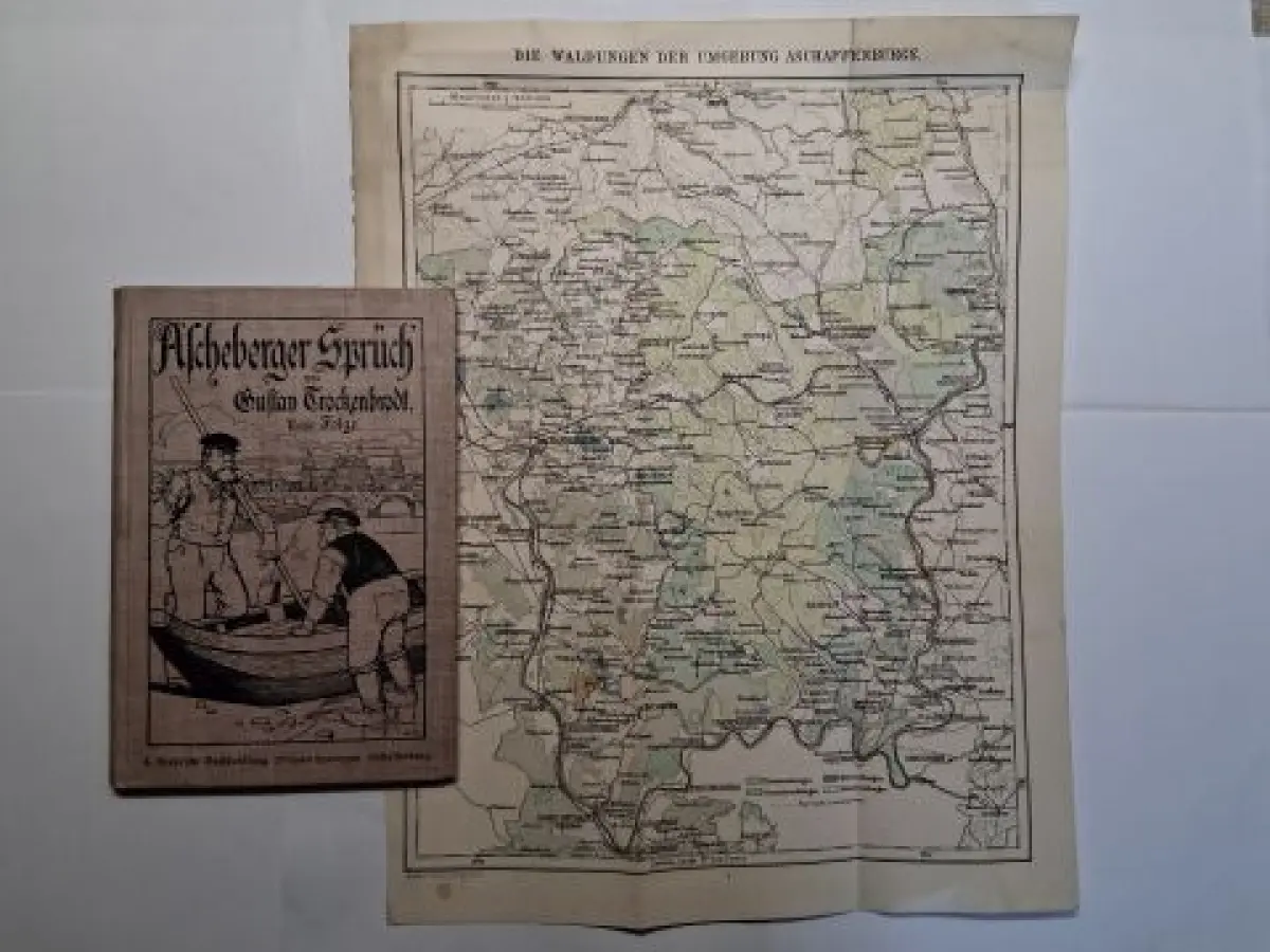 Titel: Ascheberger Sprüch`. Gedichte in Aschaffenburger Mundart von Gustav Trockenbrodt mit Zeichnungen von Adalbert Hock. Neue Folge. / + KARTE (31 x 24, 5 cm - Gotha, Julius Perthes um 1885) DIE WALDUNGEN DER UMGEBUNG ASCHAFFENBURGS *
