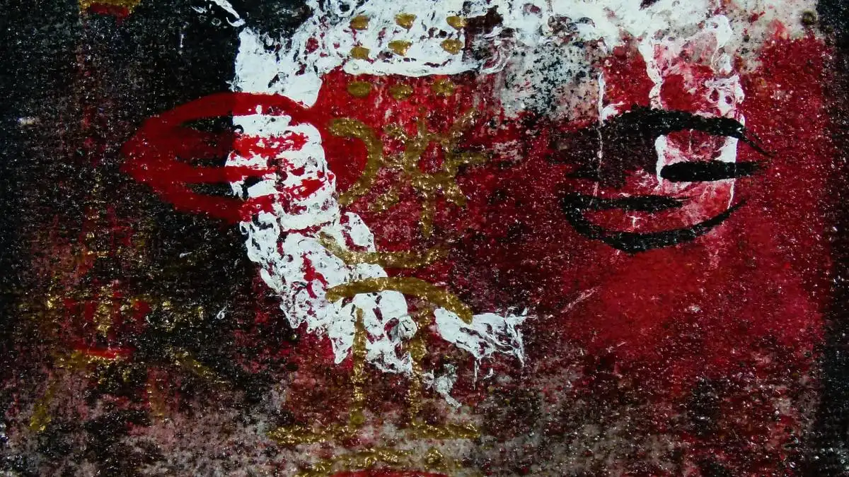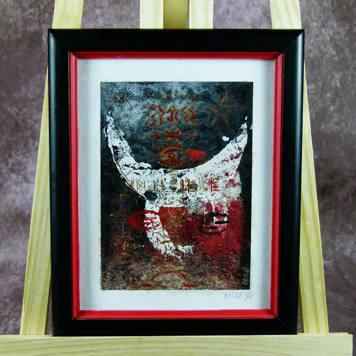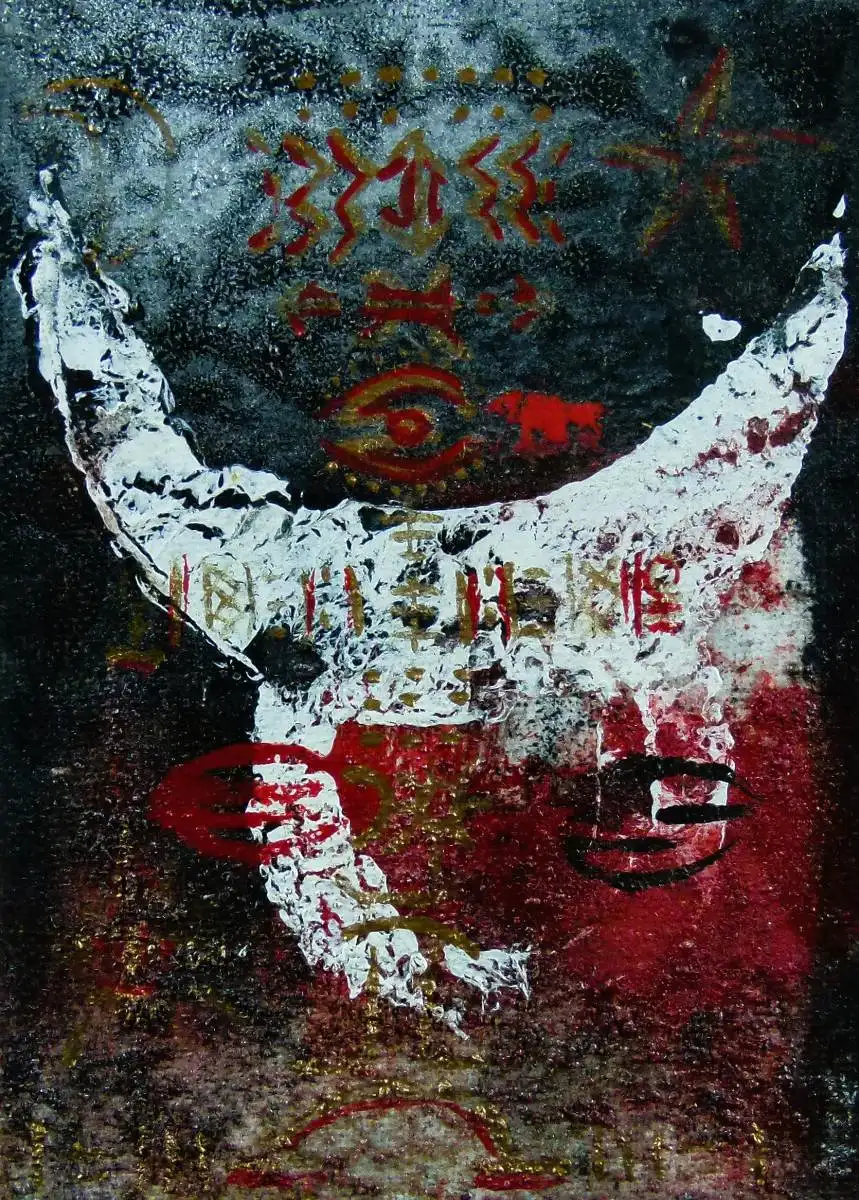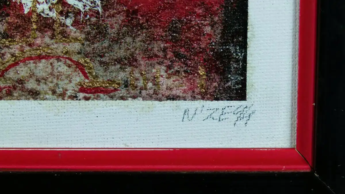 Originales Mischtechnik-Kunstwerk von der österreichischen Künstlerin Ze Nobre, 1994, mit einer faszinierenden Kombination aus Texturen und Farben. Abstrakte Komposition mit dunklem Hintergrund, kontrastreichen Rot- und Goldtönen, einem zentralen Halbmond und mystischen Symbolen wie einem Auge und geometrischen Mustern. Signiert, sehr guter Zustand. Ideal für Sammler österreichischer Kunst oder als einzigartiger Dekor-Akzent.