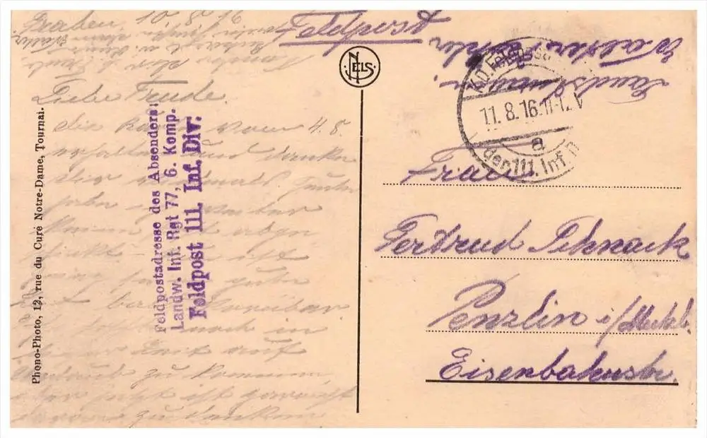 Cambrai , 1916 , L`Aveugle et le Paralytique , Feldpost , Landwehr Inf. Rgt 77 , 6.-Kompanie , 12 Inf. Division !!!