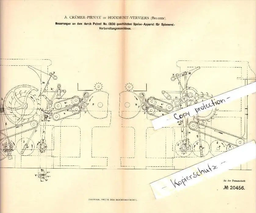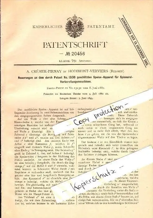 Original Patent - A. Crémer-Pirnay in Hodimont - Verviers , 1882 , Speise-Apparat für Spinnerei !!!