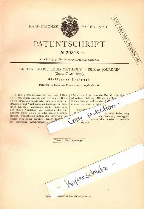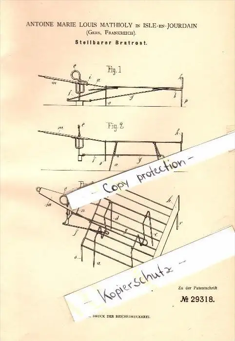 Original Patent - A.M. à Mathioly in L’Isle-Jourdain , 1884 , Grill pour le barbecue !!!