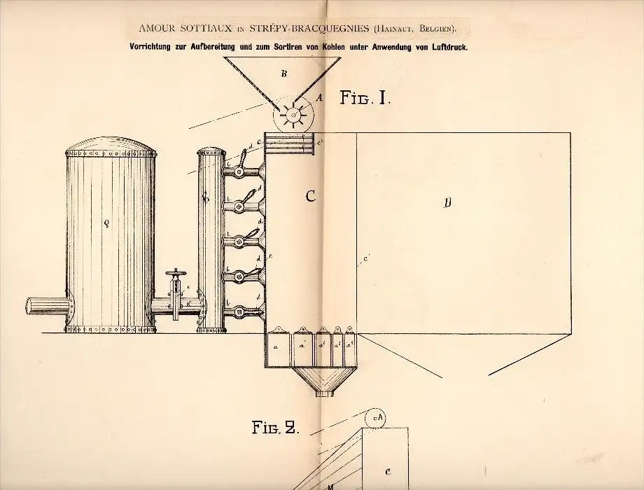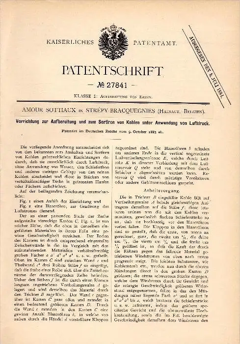 Original Patent - Amour Sottiaux in Strépy-Bracquegnies , 1883 , Aufbereitung von Kohle , Bergwerk , Erz , Hainaut !!!