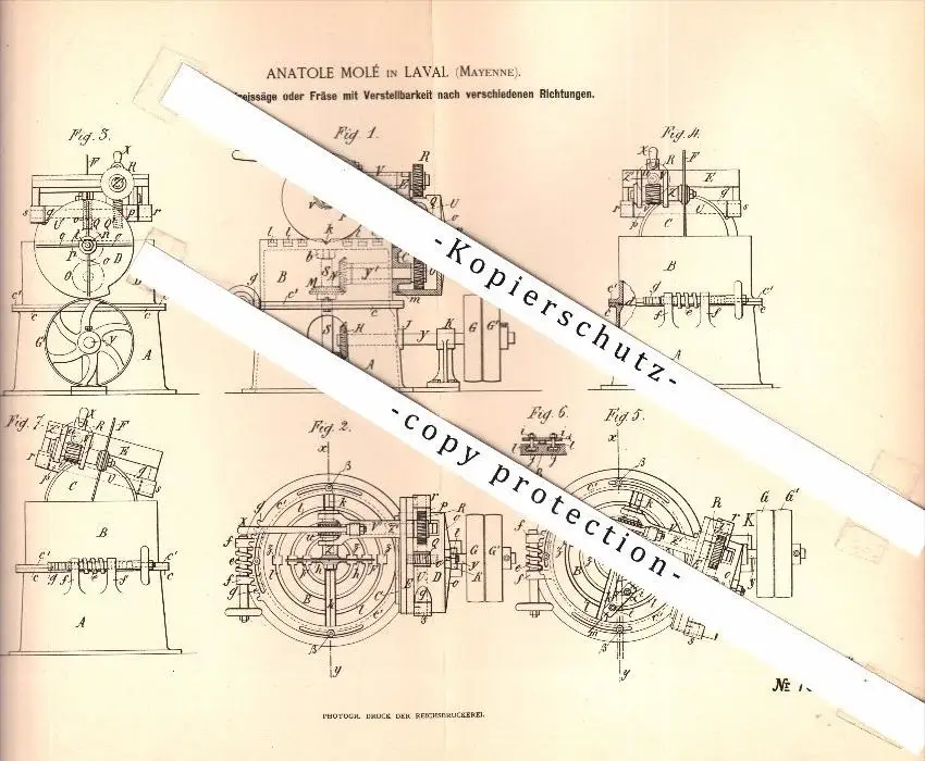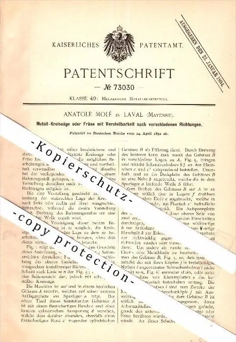 Original Patent - Anatole Molé à Laval / Mayenne , 1892 , scie circulaire !!!