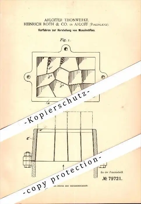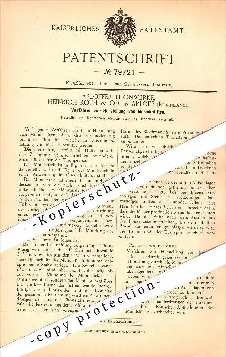 Original Patent - Arloffer Thonwerke , H. Roth & Co in Arloff b. Bad Münstereifel , 1894 , Herstellung von Mosaikstiften