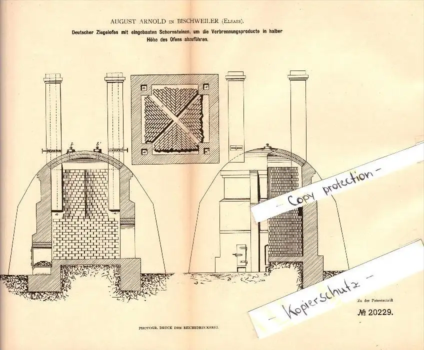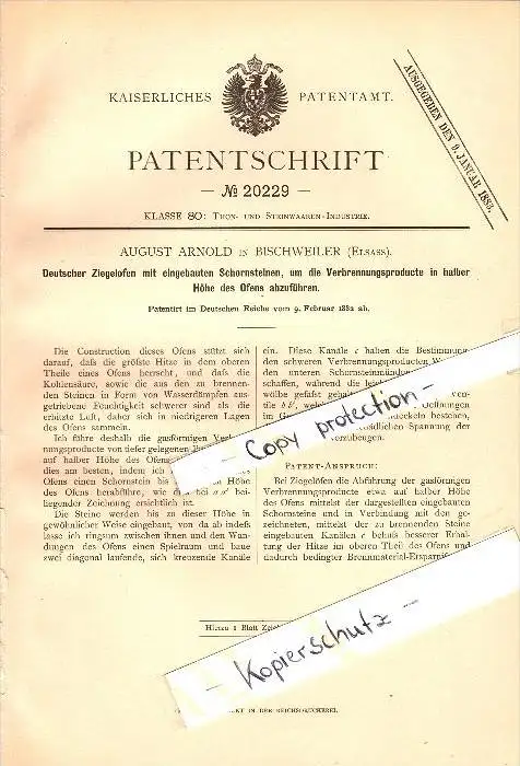 Original Patent - August Arnold à Bischweiler / Bischwiller , 1882 , Poêle en brique allemande avec cheminée !!!