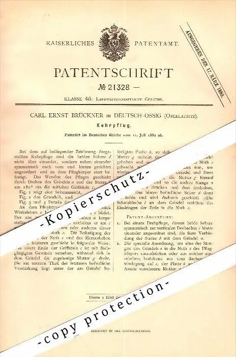 Original Patent - C.E. Brückner in Deutsch Ossig b. Görlitz , 1882 , Kehrpflug , Pflug , Landwirtschaft , Agrar !!!