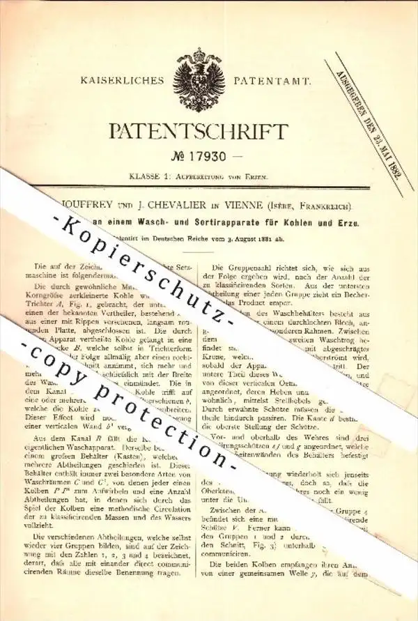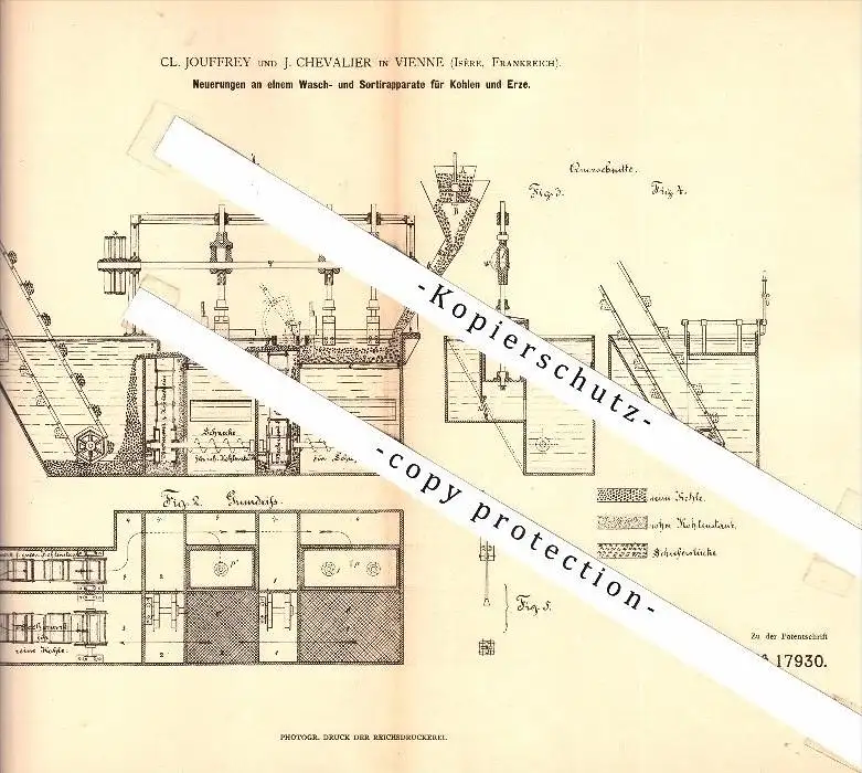 Original Patent - Cl. Jouffrey und J. Chevalier in Vienne , Isere , 1881 , Waschapparat für Erz , Bergbau !!!
