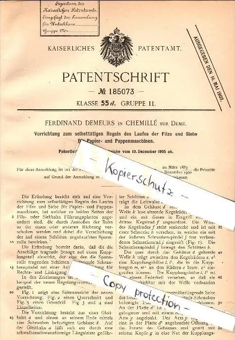 Original Patent - Ferdinand Demeurs à Chemillé sur Deme , 1905 , Machines pour papier et de carton Machine !!!