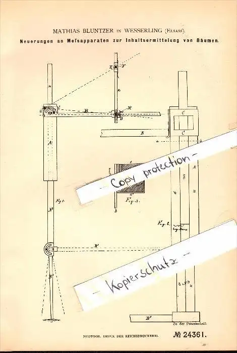 Original Patent - Mathias Bluntzer à Wesserling / Thann , 1883 , Appareil de mesure pour les arbres , bois !!!