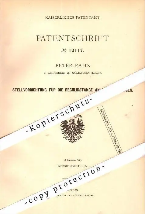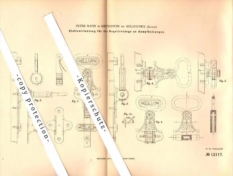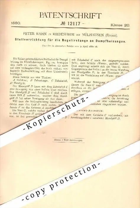 Original Patent - P. Rahn in Riedisheim , 1880 , Dispositif pour le chauffage à la vapeur , chemin de fer !!!