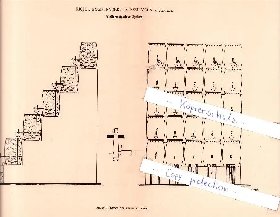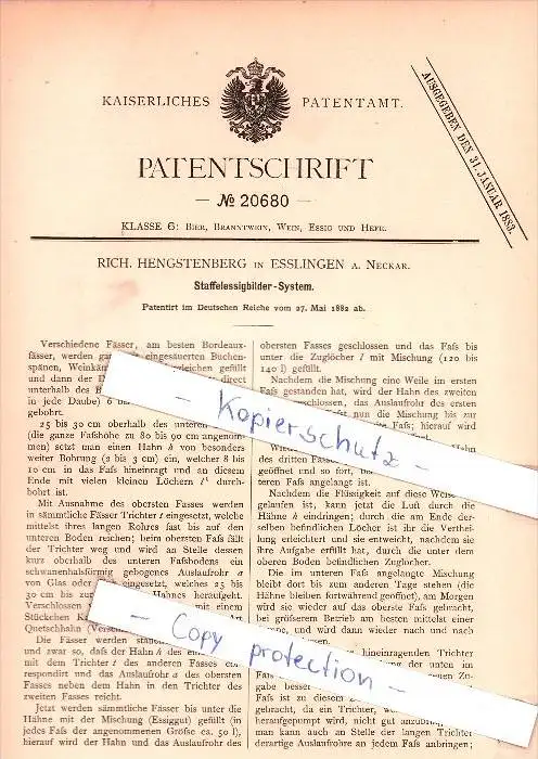 Original Patent - Rich. Hengstenberg in Esslingen a. Neckar , 1882 , Staffelessigbilder-System , Brauerei , Alkohol !!!